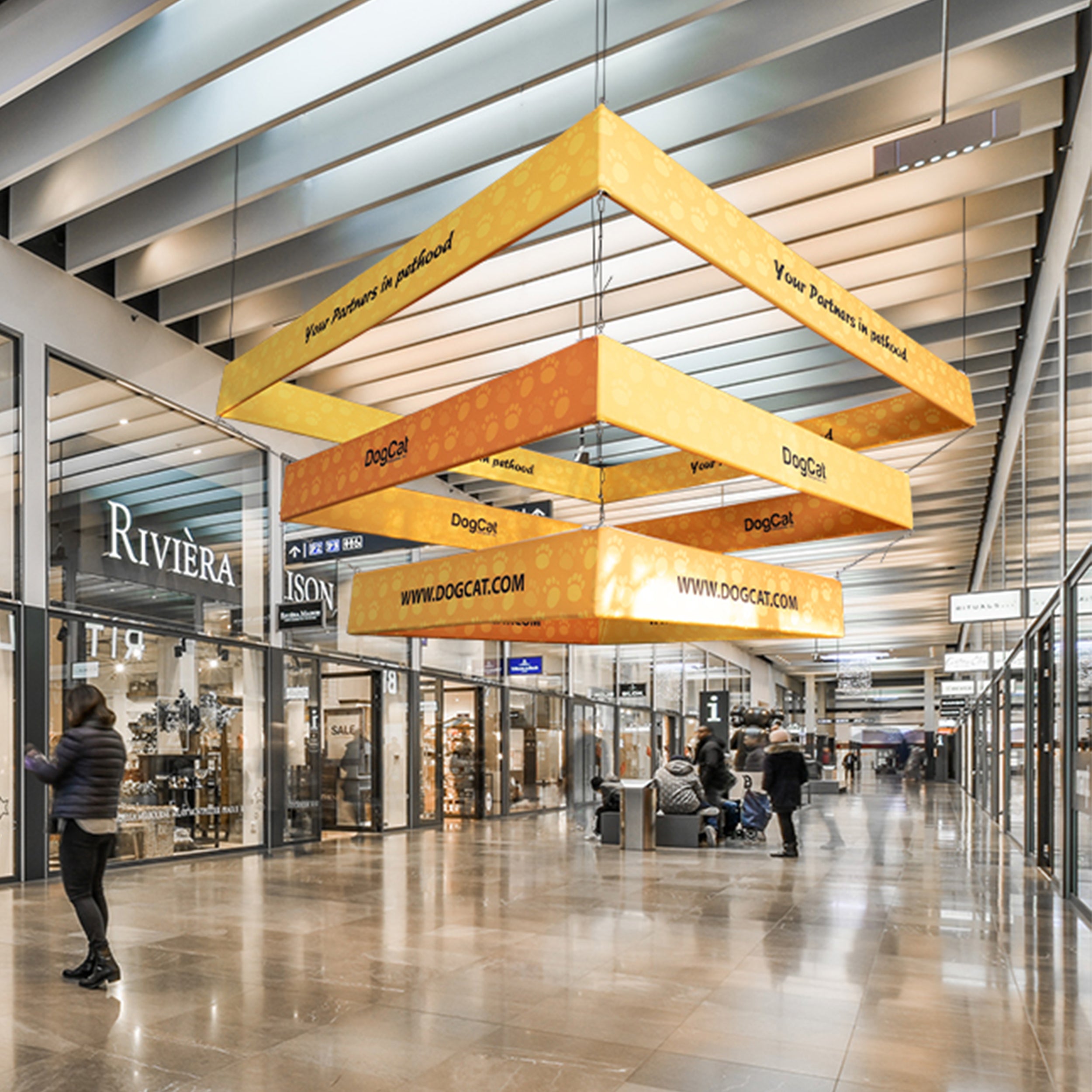 Steel cables and carabiners are rated for secure overhead suspension with multiple anchor points per frame. Flame-retardant fabric meets indoor venue safety standards. Separate frames allow the display to remain functional if one tier needs servicing.
